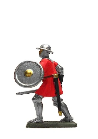 Zberateľská ručne vyrobená a ručne maľovaná cínová figúrka stredovekého anglického vojaka s mečom a kruhovýmštítom je zachytená v pohybe v bojovom postavení.