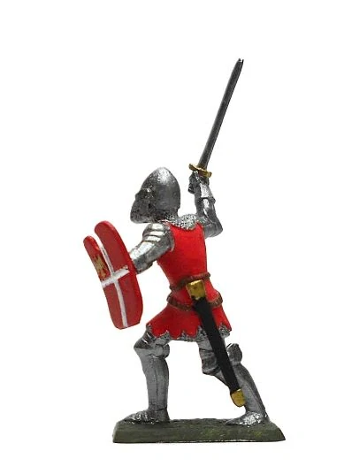 Cínový vojak v prevedení stredovekého anglického rytiera s mečom a štítom v plátovej zbroji.