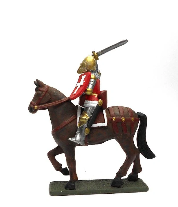 Cínový vojak v prevedení stredovekého anglického rytiera na koni, vyzbrojeného mečom a štítom.