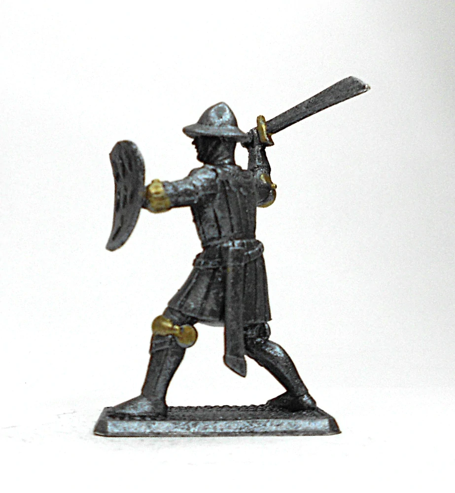 Zberateľská ručne vyrobená a maľovaná cínová figúrka stredovekého francúzskeho vojaka so sečnou zbraňou je zachytená v pohybe v bojovom postavení.