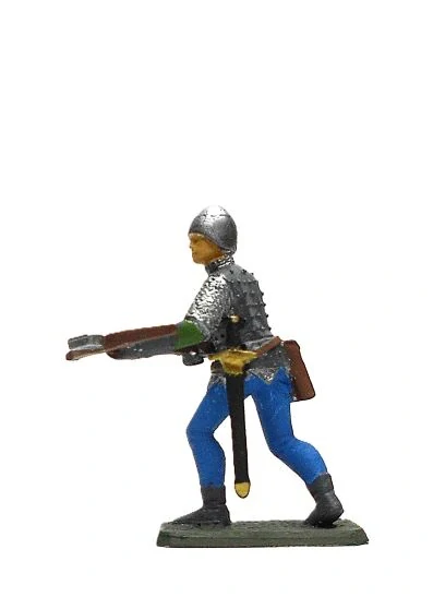 Zberateľská ručne vyrobená a ručne maľovaná cínová figúrka stredovekého francúzskeho vojaka s kušou je zachytená v pohybe v bojovom postavení.