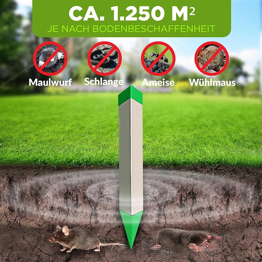Odpudzovač krtkov so zvukovou funkciou, ktorá v zemi plaší krtka a hraboše a na zemi hady. Odpudzovač krtkov, hrabošov a hadov je ekologické zariadenie, ktoré nemá negatívny vplyv na zdravie ľudí, ani domácich a hospodárskych zvierat. Odpudzovač je napájaný 4 ks 1,5 V batérií veľkosti D (nie sú súčasťou balenia). Princíp odpudzovača krtkov spočíva vo vysielaní nízkofrekvenčných zvukových vĺn bzučiakom do pôdy, ktoré sú pre krtov a hraboše nepríjemné, čím následne opúšťajú chránené miesto. Odpudzovač krtkov je vyrobený z pevných materiálov, ktoré odolávajú poveternostným vplyvom. Použitie je veľmi jednoduché, vložením batérií a zatlačením odpudzovača do pôdy, je odpudzovač pripravený na činnosť.