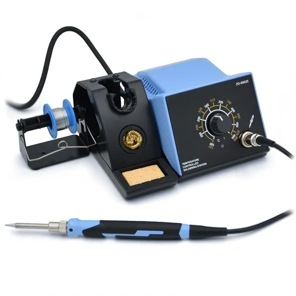 Analógová spájkovacia stanica (mikrospájka) ZD-8962E navrhnutá pre bezolovnaté spájkovanie s nastaviteľnou teplotou hrotu v rozmedzí 160 až 480 ° C je vhodná pre jemnú prácu v elektronike, Regulátorom teploty je zobrazovaná nastavená pracovná teplota spájkovacieho hrotu. Rýchle zahriatie do 8 sekúnd a výkon 70 W s rozsahom teploty 160 °C – 480 °C. Ergonomický dizajn s flexibilným silikónovým káblom a stojanom pre bezpečné odkladanie. Výmenné hroty z radu TIP N12-1 až TIP N12-6. Na čistenie hrotu je dodávaná guľa z medeného drôtu a čistiaca hubka.
